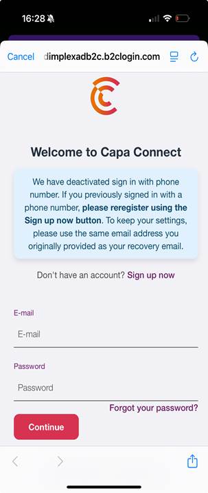 If you are unable to sign in to either Dimplex Control / ConfigR / Capa Connect apps using your usual credentials, it may be due to a security upgrade we have made earlier in 2025.